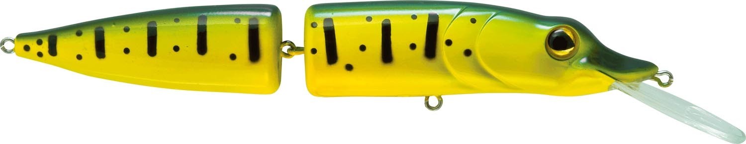 Minnow galleggiante a forma di luccio, snodato indue pezzi; la particolare paletta allungata gli permette di raggiungere una profondità di tre metri.