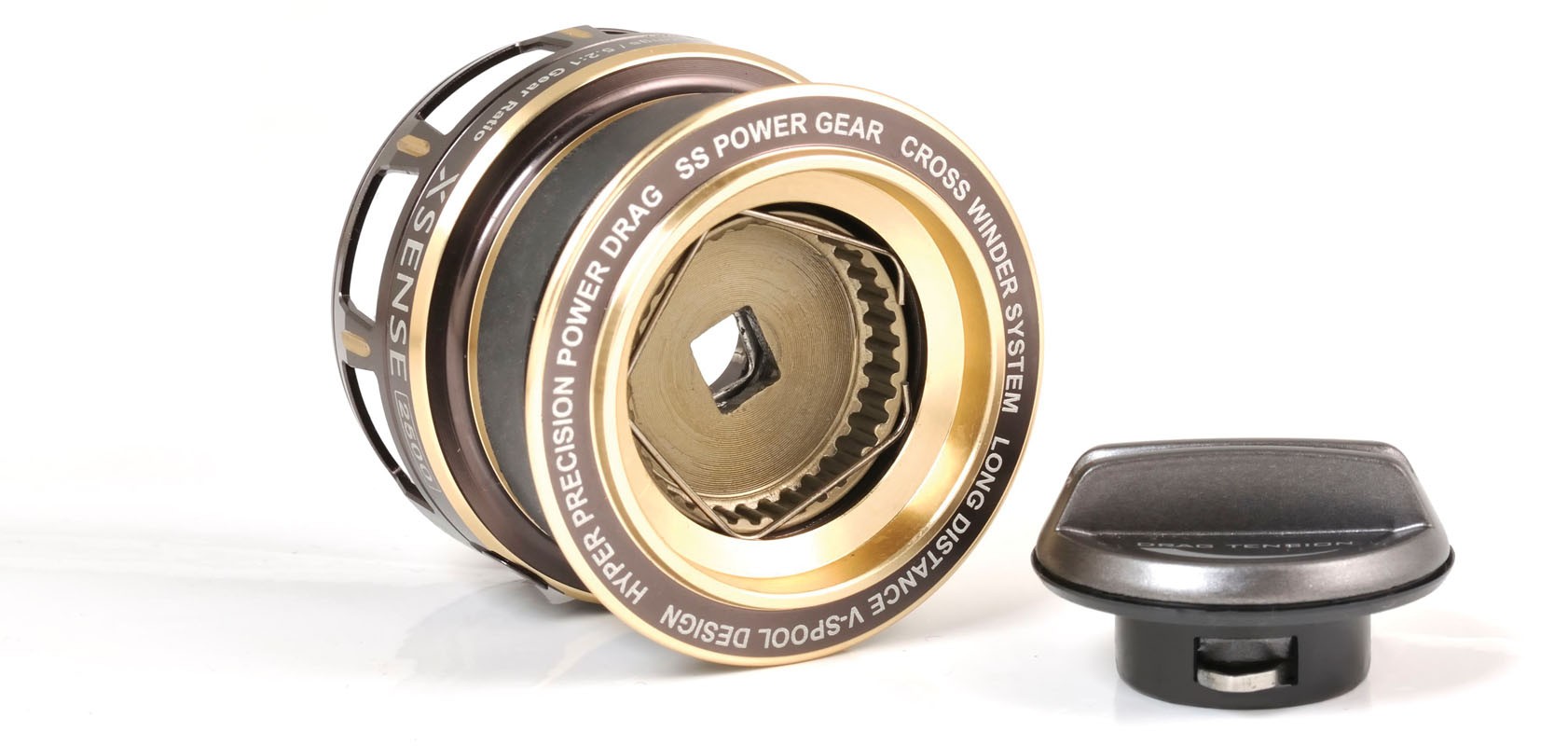 Grandissimo esercizio di stile, di gusto estetico e di design, che colpisce i sensi per l’eleganza dell’aspetto e la raffinatezza degli accostamenti cromatici, con lo champagne metallizzato, delicati toni di marrone e profili in oro senza eccessi. Ma tanta grazia nasconde un motore da formula uno, con ingranaggi e pignone in acciaio inox, cuscinetti a sfere a doppia schermatura per tenere alla larga polvere e salsedine, una manovella a presa diretta sulla drive gear per non disperdere potenza. Il tutto incastonato in un corpo metallico molto rigido, in grado di mantenere gli allineamenti degli assi principali anche durante il recupero di un pesce importante, garantendo fluidità assoluta e lunga vita all’attrezzo. In abbinamento alle canne da spinning, alle bolognesi, alle canne da trota lago è in grado di sorprendere per la sua efficienza meccanica, consentendo l’impiego di lenze multifibre grazie alla banda in gomma che ne impedisce lo slittamento all’interno della bobina.